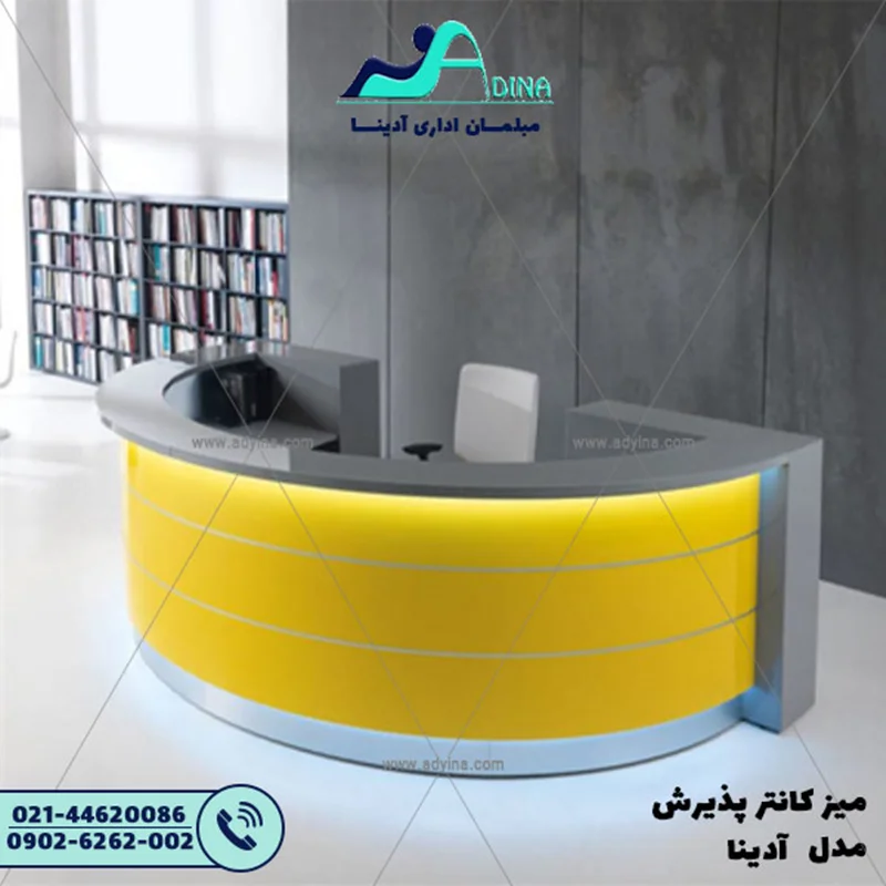 میز منشی مدل آدینا ; این کانتر پذیرش , از زیباترین مدلها کانتر پذیرش مجموعه مبلمان اداری آدینا میباشد. میز منشی مدل آدینا از سبک مدرن پیروی کرده است. انحنای این میز منشی نیم دایره جذابیت خاصی را به نمایش گذاشته است. امکان سفارش آن با رنگ انتخابی شما عزیزان وجود دارد. در ادامه با توضیحات بیشتر درباره این محصول با ما همراه باشید.