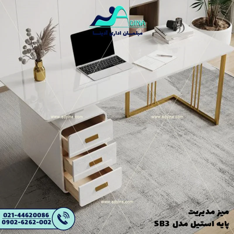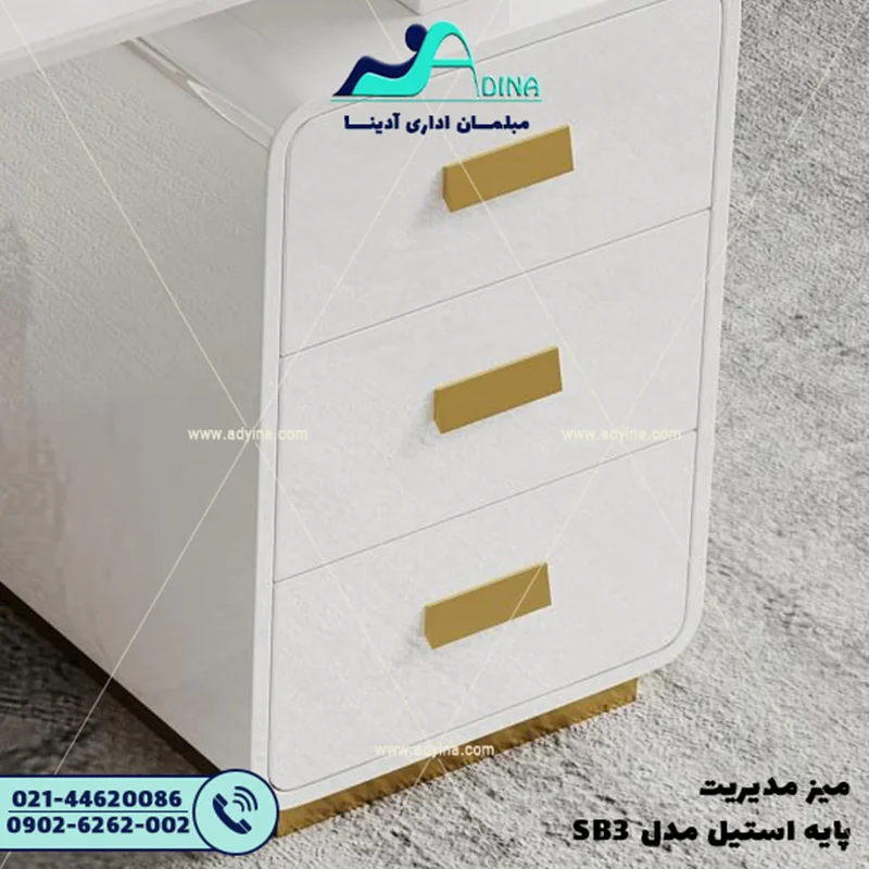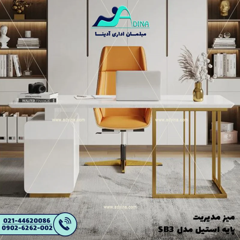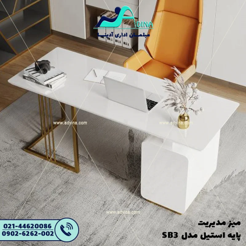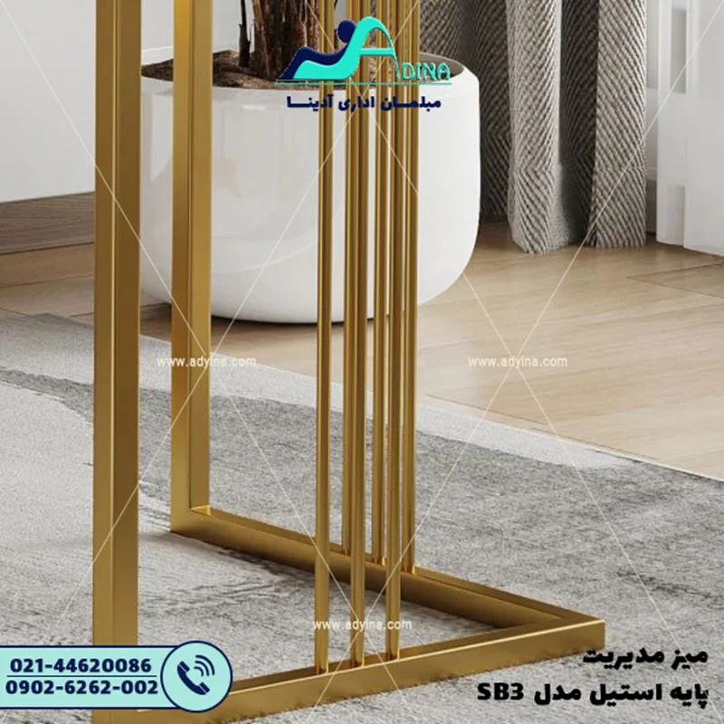 میز مدیریت پایه فلزی مدل "SB3" ; این مدیریت پایه فلزی یک محصول شیک و لوکس طراحی و ساخته شده توسط مبلمان اداری آدینا میباشد. میز مدیریت پایه فلزی مدل "SB3"دارای پایه های فلزی طلایی بوده که علاوه بر کیفیت و استحکام بالا این محصول زیبایی و شکوه را به دفتر کار شما می آورد. در ادامه با توضیحات بیشتر درباره این محصول با ما همراه باشید.