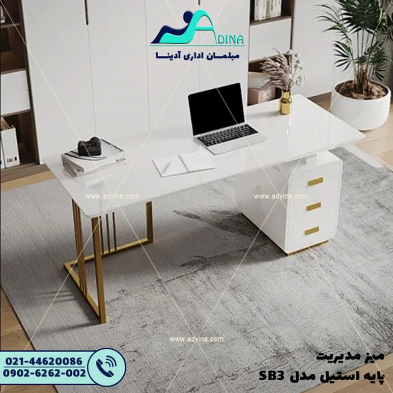 ما در مجموعه مبلمان اداری آدینا همواره بالاترین کیفیت را به مشتریان خود عرضه میکنیم. میز مدیریت پایه فلزی مدل "SB3" نیز از این موضوع مستثنی نیستند. این میز مدیریتی لوکس بهترین انتخاب برای دفاتر مدیران ارشد سازمانها و مجموعه های کاری خاص و لاکچری میباشند ; چرا که زیبایی محصور کننده ای را دارند و اعتبار بسیار زیادی را به همراه خود میآورند. یادتان باشد دکوراسیون اداری مجموعه شما است که باعث پیشرفت و برند سازی مناسب شما میشود.